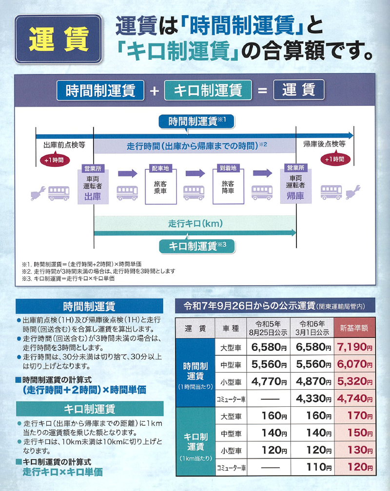 出庫から入庫までの時間に、出庫点検・帰庫点検の各1時間ずつ合計2時間を加え、時間制運賃を乗じる(最低保障として3時間に点検2時間を加算した5時間とします)。