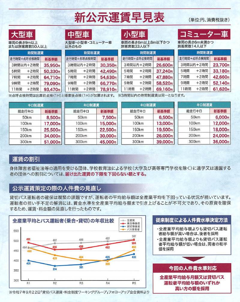 平成24年4月に発生した高速ツアーバス事故等により、貸切バス市場の現状について問題の深刻化が浮き彫りになりました。このため、国土交通省では、貸切バスの安全性向上を図る取り組みの一環として、貸切バスの運賃制度を抜本的に見直し、安全と労働環境改善コストを反映した、合理的でわかりやすい時間・キロ併用制運賃が平成26年4月より実施されました。貸切バス事業者は、各運輸局等が公示した運賃・料金で届出を行う場合、公示運賃の上限額と下限額の幅の中で運賃を決定します。下限額以下の運賃で運行すると、運行違反として行政処分となるとともに、その貸切バス事業者は安全が確保されていない可能性があります。